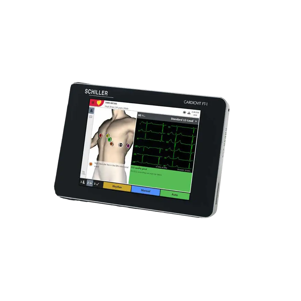 El CARDIOVIT FT-1 es un aparato ultraportátil que pesa poco más de un kilo, batería incluida. La pantalla multitáctil de 8 pulgadas y alta resolución puede manejarse con un sencillo gesto de barrido. La superficie totalmente plana y cerrada del aparato es muy fácil de limpiar y sumamente higiénica.